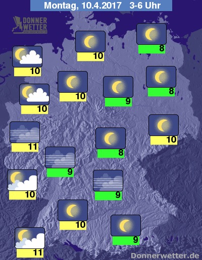In der Nacht zum Montag ist der Himmel zunächst bundesweit sternenklar. Im Nachtverlauf ziehen jedoch im Westen und Nordwesten mehr und mehr Wolken auf, dabei bleibt es aber noch meist trocken. Die Temperatur sinkt auf 11 Grad entlang des Rheins und bis 8 Grad an der Müritz.