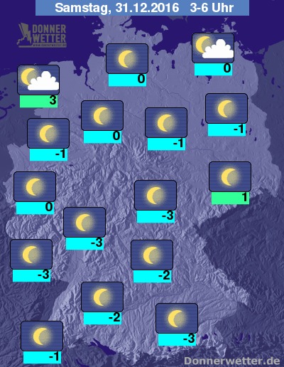 In der folgenden Nacht bleibt es über der Republik weitestgehend sternenklar, nur in den küstennahen Gebieten ziehen auch lockere Wolkenfelder durch. Es bleibt trocken bei Tiefstwerten von 3 Grad in Emden und bis -3 Grad am Odenwald.
