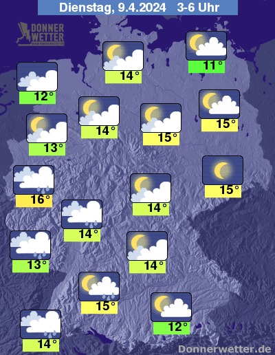 In der Nacht auf Dienstag nimmt die Bewölkung über dem Norden, Westen und Südwesten des Landes zu, dabei muss ausgangs der Nacht mit teils schauerartigem Regen gerechnet werden. In den übrigen Landesteilen bleibt es bei wechselnder Bewölkung meist trocken, im Osten und Südosten ist der Himmel auch teils sternenklar.