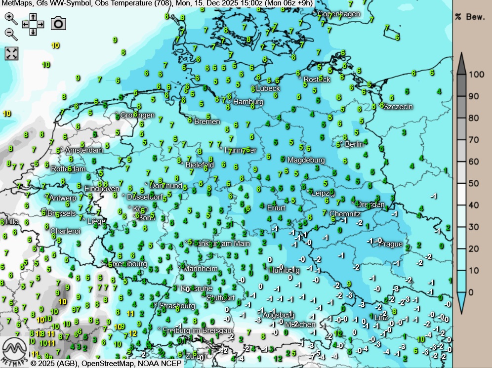 Die Höchstwerte liegen zwischen 0 Grad im Südosten und bis zu 11 Grad im Westen.