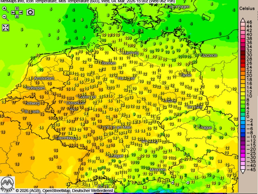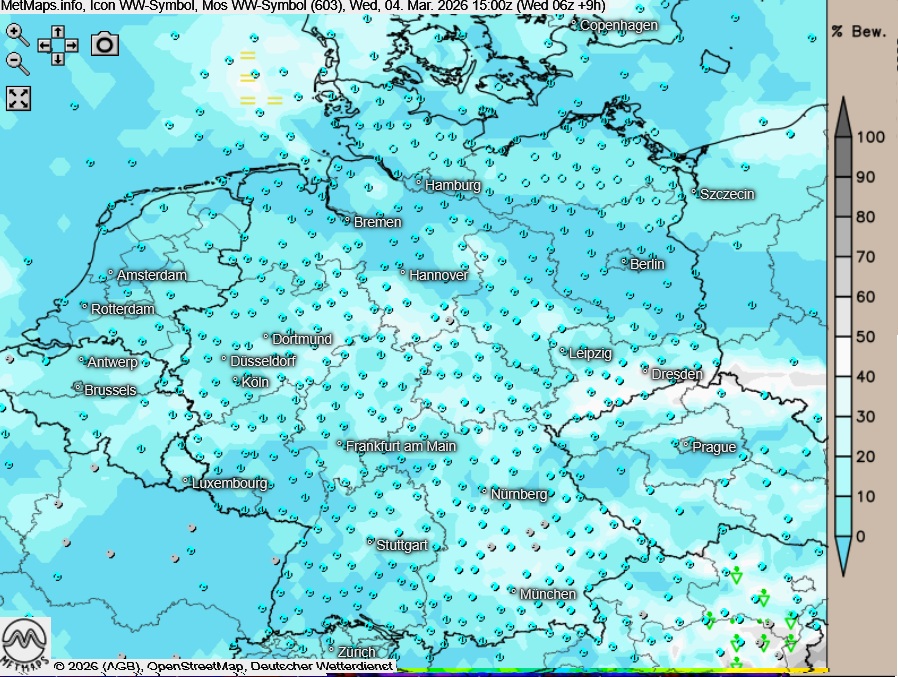 Die Temperatur- und Wetterkarte für Mittwochnachmittag (15:00 Uhr) nach ICON: