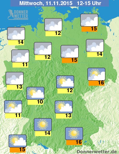 Am Nachmittag ist es in weiten Teilen der Nordhälfte dicht bewölkt oder bedeckt. Im Süden überiwiegt zur Wochenmitte weiterhin heiterer oder locker bewölkter Himmel, entlang der Donau sowie in den Mittelgebirgen sind auch längere sonnige Abschnitte möglich.