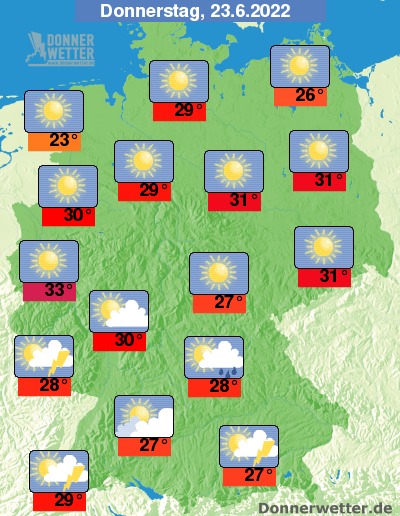 Heute ist es im Süden teils heiter, teils bilden sich einige Quellwolken, dabei sind sowohl Schauer als auch örtliche Gewitter möglich. Im übrigen Land ist es verbreitet sonnig und trocken. Die Temperatur steigt auf 23 Grad in Bremerhaven und bis 33 Grad in Köln.