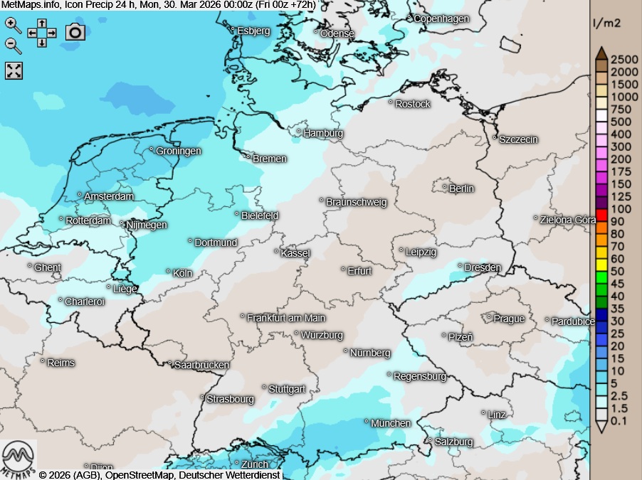 Die Strömungs- (12:00 Uhr) und Wetter- / Temperaturkarte (15:00 Uhr) sowie die 24-Stunden-Regenmengen für Sonntag nach ICON: