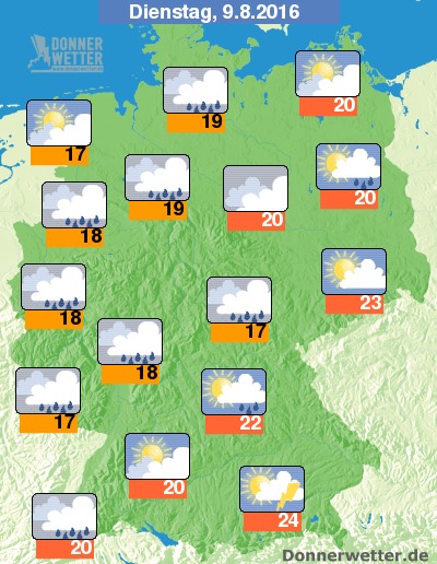 Am Dienstag ist es besonders im Süden und Osten oft locker oder aufgelockert bewölkt, sonst ziehen jedoch vor allem über die Nordwesthälfte Deutschlands häufig dichte Wolken hinweg, dabei bilden sich gebietsweise Schauer. Im Alpenvorland entwickeln sich örtlich auch Gewitter. Es werden 17 bis 24 Grad erreicht.
