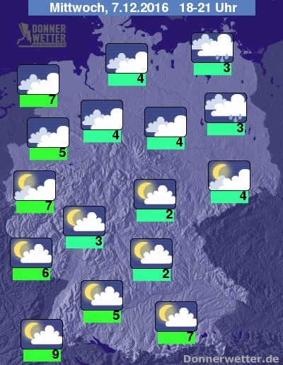 Richtung späten Abend ändert sich die Wetterlage nur geringfügig. Im Norden bleibt der Himmel meist bedeckt, im Süden und der Mitte des Landes überwiegend locker bewölkt.