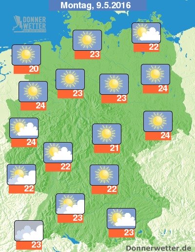 Am Montag bleibt es über der Nordosthälfte meist heiter bis sonnig und dazu trocken, im Südwesten ist es hingegen bereits zu Tagesbeginn oft stark bewölkt, sonst jedoch noch meist heiter. Im Tagesverlauf zieht auch im Westen und Süden zum Teil starke Bewölkung auf, im Südwesten und am Alpenrand sind Schauer, vereinzelt auch Gewitter möglich, sonst bleibt es aber trocken. Die Temperatur steigt auf 20 Grad an der Nordseeküste und bis 24 Grad in Berlin.