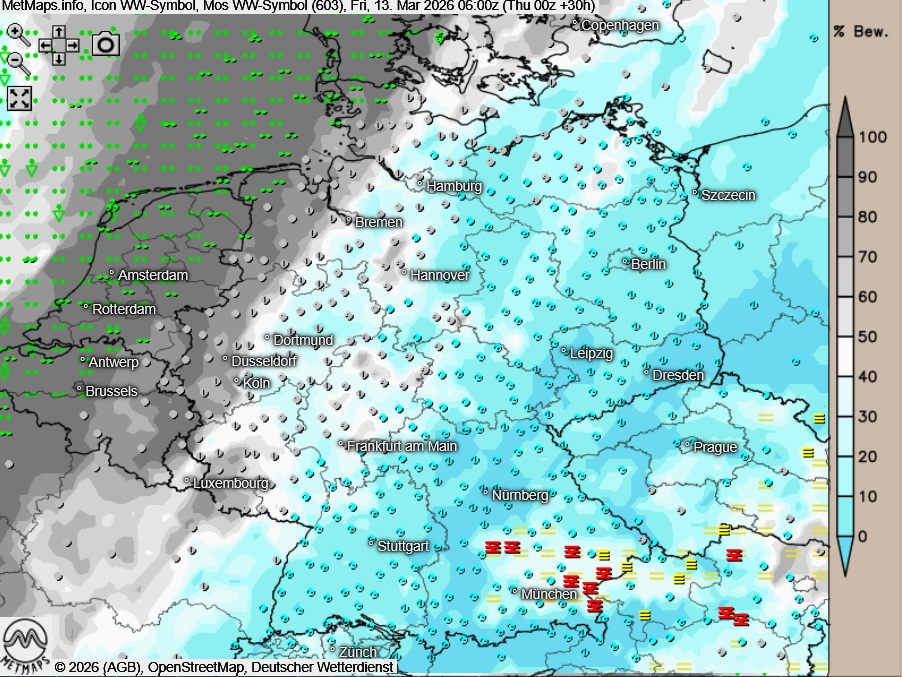 Die Wetter-, Temperatur- und Böenkarte für Freitagfrüh (06:00) sowie die 24-Stunden-Regenmengen nach ICON:
