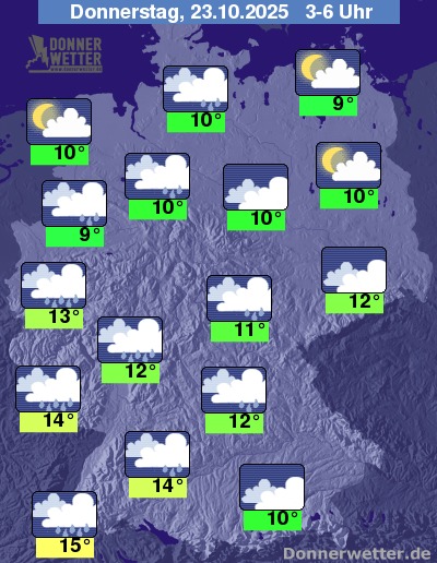 In der Nacht zum Donnerstag breitet sich der Regen von Südwesten her noch weiter aus und umfasst bis zum Morgen fast alle Landesteile bis auf den Nordosten Deutschlands. Hier ist es meist aufgelockert, oder sogar noch locker bewölkt und trocken, während sonst keine Auflockerungen zu erwarten sind. Die Temperatur sinkt auf 15 Grad in Freiburg und etwa 9 Grad in Neubrandenburg.