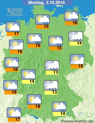 Am Tag der Deutschen Einheit zeigt sich das Wetter über dem Norden und Osten oft sehr durchwachsen mit oft dichten Wolken und zeitweiligen Regenfällen. Über der Südwesthälfte der Republik scheint hingegen häufig die Sonne bei meist nur lockerer, hier und da aufgelockerter Bewölkung, dazu bleibt es weitgehend trocken. Die Temperatur steigt auf 13 Grad im Grabfeld und bis 17 Grad an der Ems.