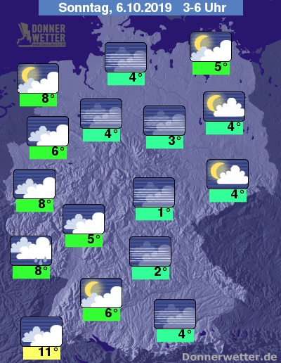 In der kommenden Nacht ist es zunächst verbreitet locker bewölkt oder sternenklar, im Westen schon hier und da stärker bewölkt, aber trocken. Westlich des Rheins werden die Wolken bis zum Morgen noch kompakter und gegen Morgen ist hier auch Regen möglich, sonst bleibt es trocken. Die Temperatur sinkt auf 11 Grad in Freiburg und bis etwa 1 Grad im Vogtland.