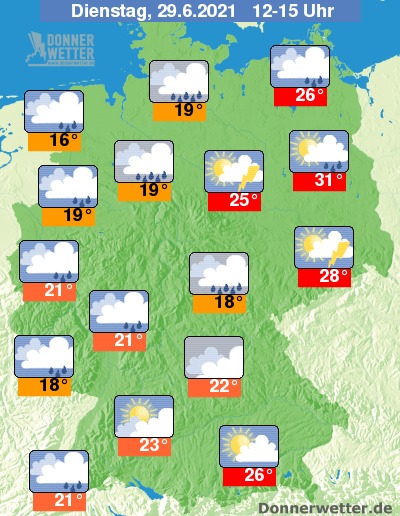 Heute Abend ist es über dem Norden und Osten meist dicht bewölkt, im übrigen Land ist es teils locker, teils dicht bewölkt. Es bilden sich landesweit Schauer und vielerorts auch Gewitter. Die Temperatur liegt bei kühlen 16 Grad an der Nordsee und bis 30 Grad in Berlin.