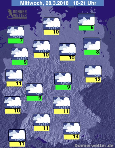Heute Abend halten sich dichte Wolken und es fällt verbreitet, vielerorts auch langanhaltender Regen. Die Temperatur bewegt sich zwischen 6 Grad in Neubrandenburg und bis 14 Grad in München.