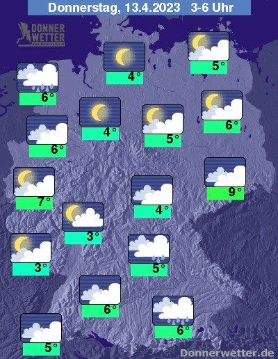 In der bevorstehenden Nacht fällt im Süden, anfangs auch im Osten unter dichten Wolken noch häufig Regen. Im übrigen Land lockert die Bewölkung auf und zum Teil wird es auch sternenklar, dazu bleibt es vorerst trocken. Erst gegen Morgen zieht im Nordwesten neuer Regen auf. Die Temperatur sinkt auf 9 Grad in Dresden und 3 Grad in Saarbrücken.
