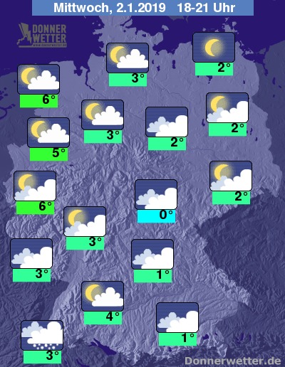 Am Abend wechseln sich Wolken und Sterne miteinander ab, über Mecklenburg-Vorpommern ist der Himmel auch längere Zeit aufgeklart. Im südlichen Schwarzwald, sowie an den Alpen fallen noch Schneeflocken, im Tiefland zum Teil auch mit Regen vermischt. Sonst bleibt es weitgehend trocken.