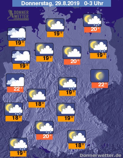 In der Nacht auf Donnerstag verdichten sich die Wolken vor allem in der West- und Nordwesthälfte Deutschlands. In den übrigen Landesteilen überwiegen meist lockere Wolkenfelder, im äußersten Südosten ist es teils auch sternenklar. Vor allem entlang der Küsten, in Bayern sowie entlang des Rheins muss zeitweise mit Schauern gerechnet werden.