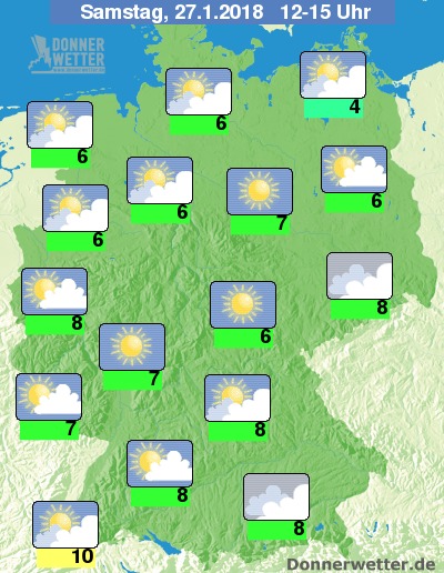 Heute Nachmittag zeigt sich im Land häufig die Sonne und es ziehen meist nur lockere bis aufgelockerte Wolken durch, dabei bleibt es trocken. Vor allem über Sachsen und dem Alpenvorland bleibt es auch oft stark bewölkt oder trüb, jedoch meist trocken. Die Temperatur liegt bei 4 Grad in Stralsund und bis 10 Grad im Breisgau.