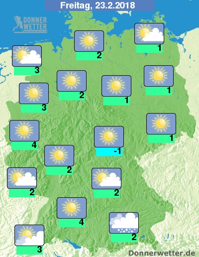 Ganz im Norden wechseln sich Sonne und wolkige Abschnitte miteinander ab. Es sollte jedoch trocken bleiben. Im Alpenvorland hält sich meist eine dichtere Wolkendecke, aus der es noch etwas schneien kann. Dazwischen strahlt verbreitet die Sonne von einem blauen Himmel. Die Höchsttemperaturen liegen allgemein zwischen 0 und 5 Grad. Im Süden bleibt es gebietsweise bei leichtem Dauerfrost. Der Nordost- bis Ostwind bläst spürbar und ist sehr unangenehm, weil er einem die Temperaturen noch wesentlich kälter empfinden lässt.