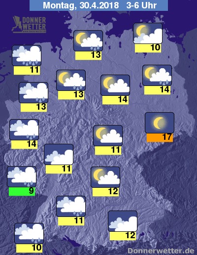 In der kommenden Nacht bleibt der Himmel von Bayern bis nach Sachsen meist locker bewölkt oder sternenklar und dazu auch trocken. Über dem Westen und Norden halten sich dagegen meist dichte Wolken und es bilden sich vielerorts Schauer sowie einzelne Gewitter. Im übrigen Land ist es teils aufgelockert, teils stark bewölkt, aber weitgehend trocken. Die Temperatur sinkt auf 17 Grad in Dresden und bis 9 Grad am Pfälzer Wald.