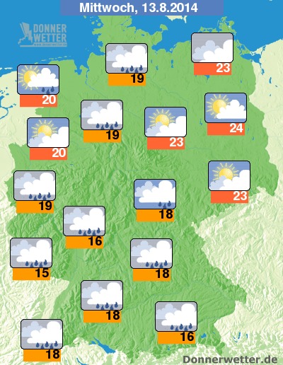 Heute ist es vor allem in Ostdeutschland zunächst noch häufig freundlich und trocken, sonst ziehen von Westen aber zunehmend dichte Wolken auf und besonders in Süddeutschland fällt zum Teil langanhaltender und ergiebiger Regen. Die Temperaturen steigen auf teils nur kühle 15 Grad im Pfälzer Wald und etwa 24 Grad in Berlin.