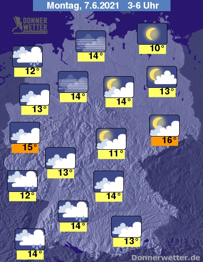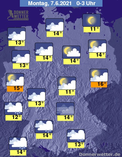 In der Nacht auf Sonntag zeigt sich der Himmel meist stark bewölkt oder bedeckt, Auflockerungen finden sich vor allem zeitweise im Westen sowie im Osten Deutschlands. Im äußersten Nordosten kann es auch aufklaren. Vor allem im Südwesten und entlang der Donau sowie später im Nordwesten sind in der Nacht einzelne Schauer möglich, sonst bleibt es meist trocken.