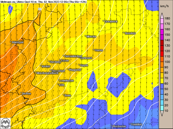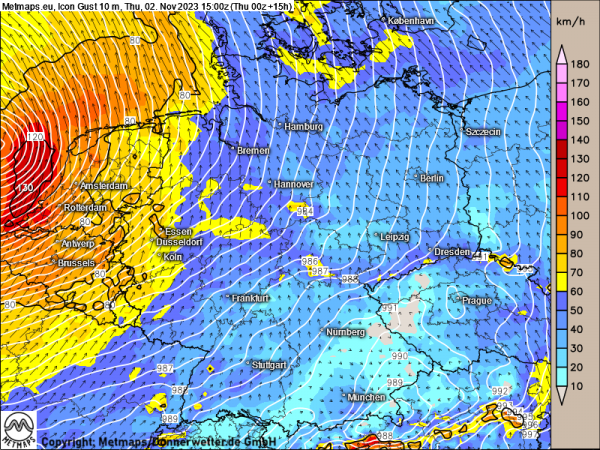 Auch in den Nachmittagsstunden besteht, vornehmlich in der Westhälfte, weiterhin ein hohes Sturmrisiko.