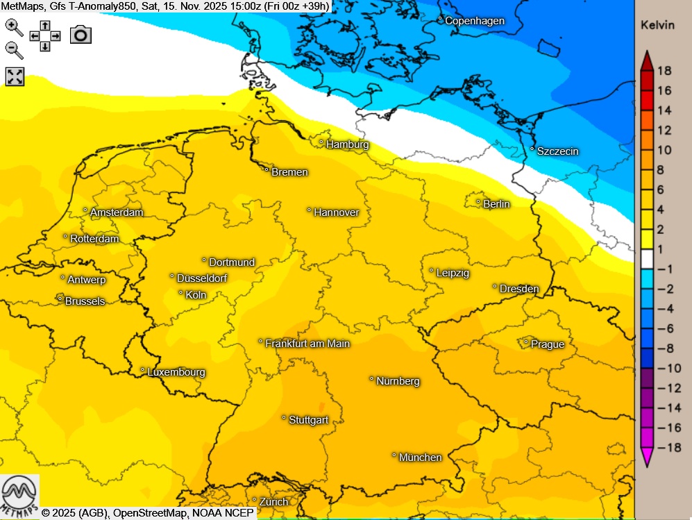 Die Strömungs- / Temperaturkarte sowie die Temperaturabweichung für Samstagnachmittag (15:00 Uhr) nach GFS:
