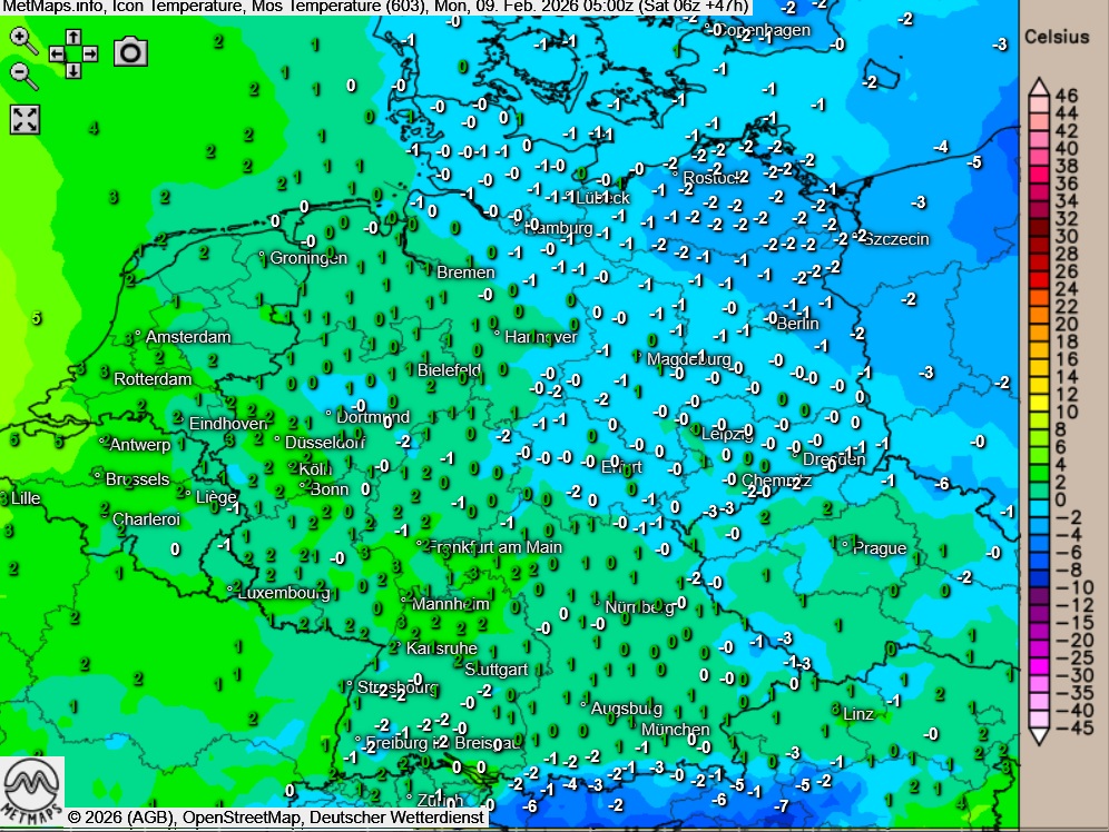 Die Temperatur- / Wetterkarte für Montagfrüh 05:00 / 06:00 Uhr nach ICON: