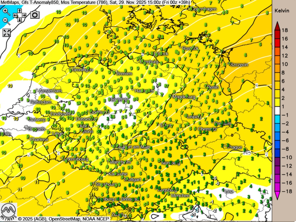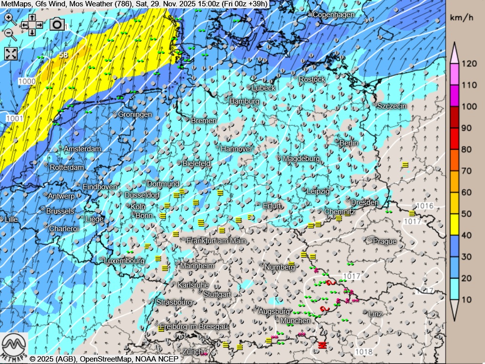 Die Böen- / Wetterkarte sowie die Temperaturen / Temperaturanomalien für Samstagnachmittag nach GFS: