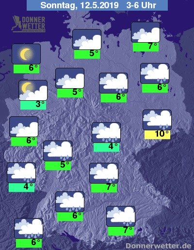 In der kommenden Nacht bleibt es zunächst bei den meist dichten Wolken und vor allem über der Südosthälfte Deutschlands fällt weiterhin, teils noch schauerartiger Regen. Zum Morgen hin klingen die Niederschläge zumindest im Norden und Westen ab von Nordwesten her klart es immer weiter auf. Die Temperatur sinkt auf 10 Grad in Dresden und bis auf etwa 3 Grad in Münster.