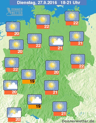 Am Dienstagabend bleibt es über weiten Landesteilen heiter oder sonnig. Lockere Wolkenfelder ziehen meist nur über Baden-Württemberg hinweg. Schauer sind am Abend nicht zu erwarten, die Temperaturen liegen noch bei angenehmen 19 bis 22 Grad C.