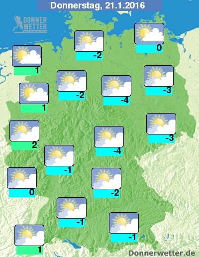 Heute ist es am Bayerischen Wald und in Sachsen zunächst oft stark bewölkt und gebietsweise fällt hier etwas Schnee, dabei kann es stellenweise glatt sein, im weiteren Verlauf lockert es hier jedoch meist etwas auf und es bleibt trocken, sonst ist es über der Südhälfte meist wechselnd bewölkt und dazu trocken. Über der breiten Landesmitte ist es anfangs noch teils stark bewölkt, jedoch trocken, sonst scheint aber verbreitet die Sonne bei höchstens lockeren Wolken, oft ist es wolkenlos, dabei bleibt es trocken. Die Temperatur steigt auf -4 Grad im Thüringer Becken und bis 2 Grad im Rheinland.