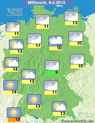 Am Mittwoch ist es im Südwesten des Landes meist sonnig, im übrigen Land zieht hingegen oft starke Bewölkung durch, dazu kann zwischen der Mitte und dem Osten Deutschland auch gelegentlich etwas Regen fallen, sonst bleibt es weitgehend trocken. Gute Chancen auf Auflockerungen bestehen zudem auch in der Südwesthälfte und am Nachmittag auch im Norden Deutschlands. Die Temperatur steigt auf 9 Grad im Thüringer Becken und bis 15 Grad im Breisgau.