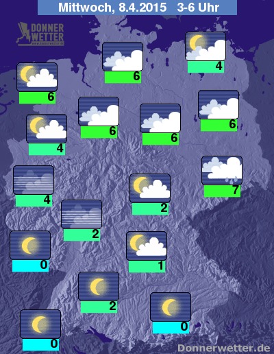 In der folgenden Nacht bleibt es im Norden und Osten meist stark bewölkt oder bedeckt, gebietsweise lockert die Bewölkung aber auch mal etwas auf, dazu kann vereinzelt etwas Regen oder Sprühregen fallen. Im Westen ist es meist locker bewölkt, stellenweise bildet sich hier jedoch Nebel oder Hochnebel, dabei bleibt es trocken. Weiter nach Süden bleibt es bei weitgehend sternenklarem Himmel ebenfalls trocken. Die Tiefstwerte liegen bei 7 Grad in Dresden und 0 Grad am Fuß des Schwarzwalds.