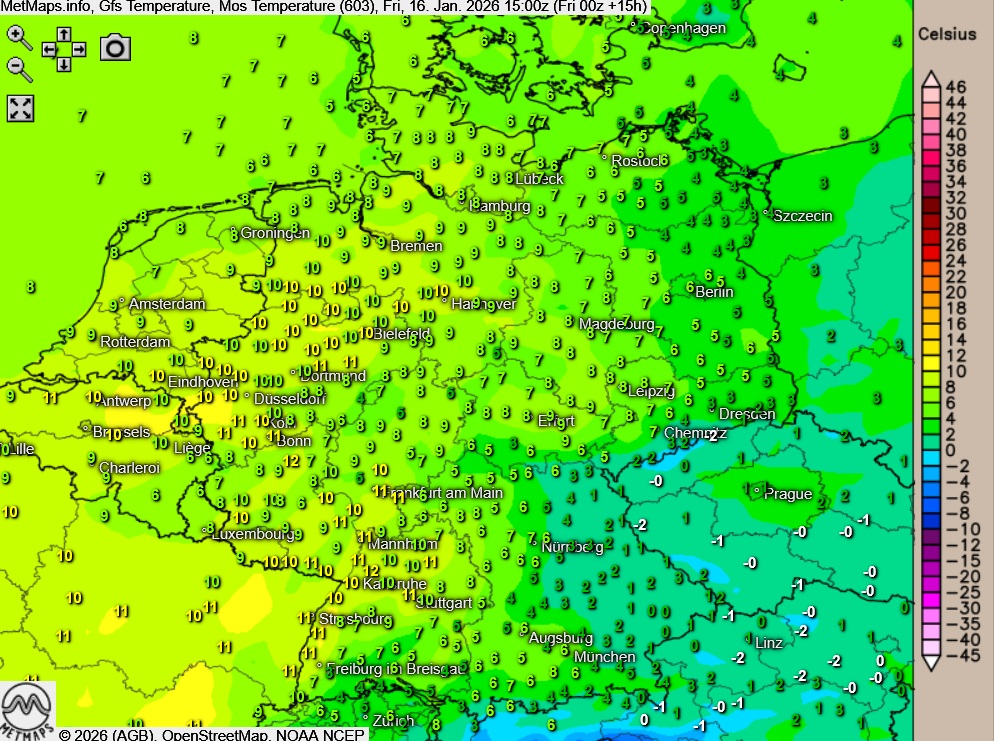 Die Temperaturen erreichen im Dauernebel teils nur Höchstwerte um -2 Grad, am Oberrhein werden mit Werten um 12 Grad die höchsten Temperaturen erreicht.