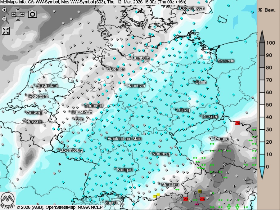 Die Wetter- und Temperaturkarte für Donnerstagnachmittag (15:00 Uhr) nach GFS: