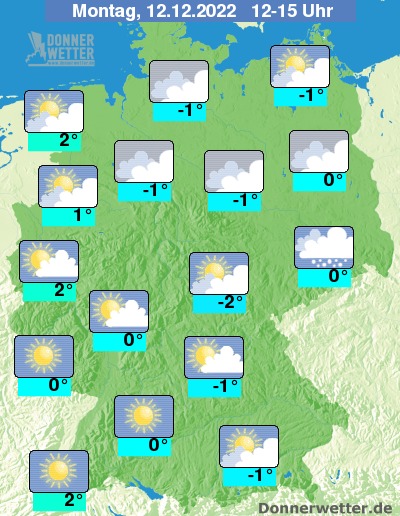 Am Montagnachmittag bleibt der Himmel über dem Osten und Südosten Deutschlands stark bewölkt oder es ist bedeckt, im Südwesten ist zeitweise leichter Schneefall möglich. In den übrigen Landesteilen ist es heiter oder nur leicht bewölkt, vor allem im Westen und Südwesten scheint die Sonne auch längere Zeit von einem wolkenlosen Himmel. Dabei bleibt es trocken.