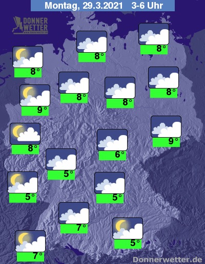 In der folgenden Nacht bleibt die Wolkendecke überwiegend verschlossen, im Laufe der zweiten Nachthälfte lockert es im Süden und Westen jedoch vielerorts auch auf. Es bleibt landesweit trocken bei 9 Grad in Münster und bis 5 Grad in München.