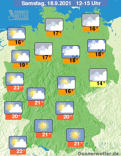 Heute Nachmittag ist es im Norden und Osten meist stark bewölkt, dabei bilden sich einzelne Schauer. Weiter nach Südwesten hin zeigt sich das Wetter hingegen meist heiter bis sonnig, hier und da können aber auch einige Wolken durchziehen, dabei bleibt es trocken. Die Temperatur liegt bei 14 Grad in der Lausitz und bis 23 Grad im Rheinland.