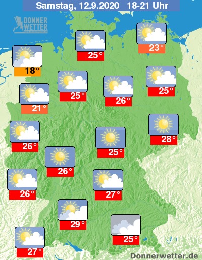 Heute Abend ziehen vor allem im Norden oft einige und im Nordseeumfeld teils dichte Wolken auf, dabei ist hier etwas Regen möglich. Auch im Süden und Südosten ziehen zum Teil einige und teils dichte Wolken durch, hier bleibt es aber trocken. Im übrigen Land ist es weiterhin heiter bis sonnig und ebenfalls trocken. Die Temperatur liegt bei 18 Grad in Cuxhaven und bis 29 Grad in Stuttgart.