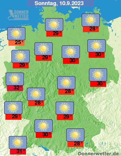 Am Sonntag scheint die Sonne von einem oft stahlblauen Himmel. Lediglich an den Alpen und an der Nordsee sind auch mal einige Wolken möglich. Es bleibt trocken bei Höchstwerten von 25 Grad in Cuxhaven und bis 32 Grad in Bonn.