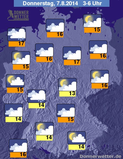 In der Nacht zum Donnerstag lässt der Regen in der Westhälfte des Landes immer weiter nach, es bleibt aber hier häufig stark bewölkt, gebietsweise lockert es auf. Weiter nach Osten bleibt es bei wechselnder bis starker Bewölkung weitgehend trocken. Die Temperatur sinkt auf 17 Grad im Emsland und 13 Grad im Thüringer Wald.