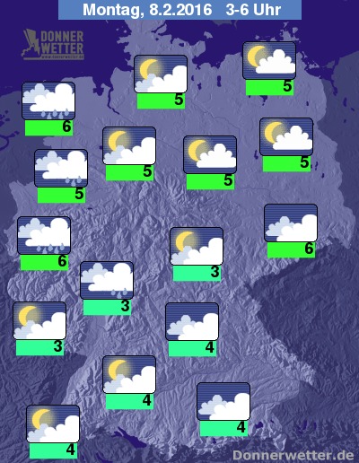 In der bevorstehenden Nacht ist es zunächst noch verbreitet aufgelockert oder stark bewölkt und dabei trocken. In den westlichsten Landesteilen ziehen jedoch schon dichte Wolken und zum Teil kräftiger Regen durch, bis zum Morgen breitet sich das Regengebiet dann über den Westen und den Norden Deutschlands aus. Im Süden und Osten nimmt die Bewölkung zwar weiter zu, hier bleibt es aber noch weitgehend trocken. Die Temperatur sinkt auf 6 Grad am Niederrhein und etwa 3 Grad im Eichsfeld. Im Westen und Norden weht zunehmend stürmischer Wind, an der See und in höheren Lagen herrscht Sturm mit teils orkanartigen Böen, im Flachland sind schwere Sturmböen möglich.