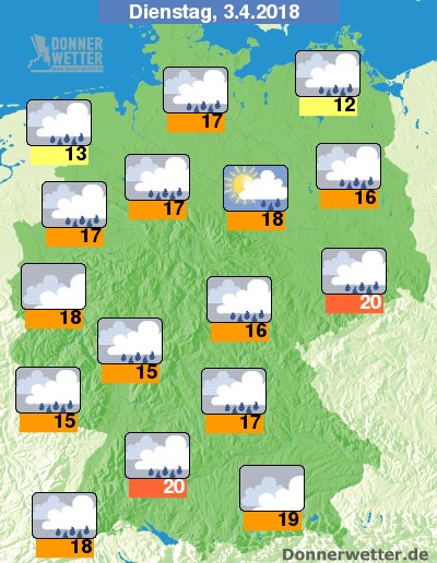 Leichter Regen im Norden entfernt sich Richtung Ostsee. Sonst dominieren abgesehen kurzer Aufheiterungen die Wolken. Im Nordwesten können örtliche Schauer auftreten. Von Frankreich zieht im Tagesverlauf etwas Regen in den Südwesten herein. Die Tageshöchstwerte liegen bei frühlingshaften 13 bis 21 Grad. Kühler bleibt es im Küstenumfeld. Der Süd- bis Südwestwind kann gebietsweise etwas auffrischen.