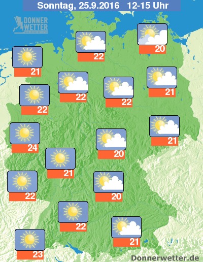 Die Temperaturen erreichen im Tagesverlauf Höchstwerte um 20 Grad C an der Ostseeküste und um 24 Grad C im Rheinland.