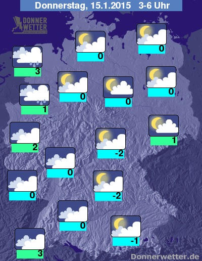 In der Nacht zum Donnerstag klingen auch im Osten die Niederschläge ab und der Himmel lockert nach und nach auf, in den anderen Landesteilen ist es bereits meist aufgelockert bewölkt, teils auch sternenklar und trocken. Im Laufe der zweiten Nachthälfte ziehen im Westen und Norden jedoch erneut dichte Wolken auf und es fällt zeitweise Regen, in der Südosthälfte Deutschlands bleibt es bis zum Morgen noch weitgehend trocken. Die Temperatur sinkt auf 3 Grad an der Nordsee und auf -2 Grad in Franken. Im Norden und Westen weht ein teils starker bis stürmischer Wind mit möglichen Sturmböen. Auf den Hochlagen der Mittelgebirge und an der Nordseeküste ist es stürmisch mit teils schweren Sturmböen.