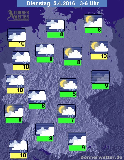 In der Nacht zum Dienstag ziehen dichte Wolken mit teils kräftigem Regen vom Südwesten über die Mitte des Landes hinweg und erreichen gegen Morgen auch Sachsen-Anhalt. Im übrigen Bundesgebiet ist es teils aufgelockert, teils aber auch stark bewölkt, dabei ist nur hier und da auch mal etwas Regen möglich. Die Temperatur sinkt auf 10 Grad in Düsseldorf und etwa 5 Grad am Thüringer Wald.