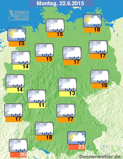 Am Montag bleibt es den Tag über verbreitet stark bewölkt und es zeigen sich nur selten Auflockerungen am Himmel. Dazu fällt immer wieder, oft auch schauerartiger Regen. Im Norden und Westen sind zudem Gewitter möglich. Die Temperatur steigt auf teils nur 11 Grad im Westerwald und bis 23 Grad in München.