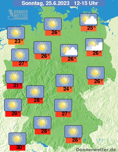 Heute Nachmittag scheint die Sonne über dem Land von einem mehrheitlich wolkenlosen Himmel. Vor allem im Nordosten ziehen auch einige, meist noch aufgelockerte Wolken durch, dazu bleibt es weitgehend, sonst komplett trocken. Die Temperatur liegt bei 23 Grad in Cuxhaven und rund 31 Grad in Köln.
