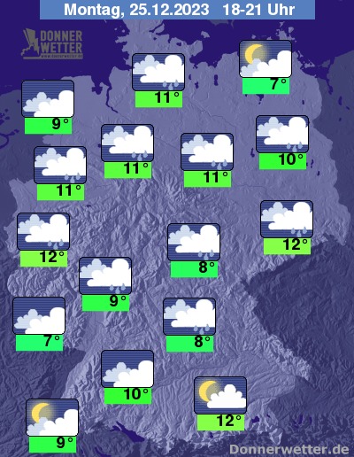 Heute Abend bleibt es im Süden und im Nordosten bei teils aufgelockerter, teils starker Bewölkung trocken. Im übrigen Land ziehen dichte Wolken durch und es fällt häufig auch Regen. Die Temperatur liegt bei 7 Grad in Vorpommern und 12 Grad im Rheinland. Es weht ein starker und oft sogar stürmischer Wind mit möglichen Sturmböen.